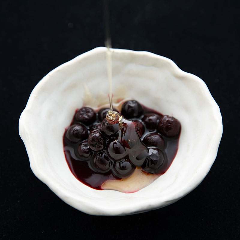こうして生まれたアロニアは、私たちの代表商品「赤いはちみつ」の原材料としても使用され、店頭カフェではアロニアスムージーやスイーツとしてご好評いただいています。
