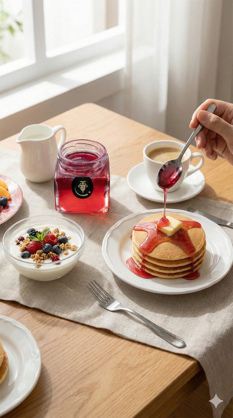 想像してみてください。 朝の柔らかな光が差し込む食卓で、あの人がこの「赤い宝石」の蓋を開ける。 スプーンですくい上げた蜜が、光を透かしてヨーグルトの上でキラキラと輝く。